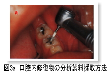 パッチテスト陽性患者は,口腔内修復物の現症からの判断で,必要に応じて鈴木)の金属生検法にて,口腔内修復物および日常生活用品等の定性分析を行っている.これはFGホワイトポイントを金属修復物表面に低速回転で押し当て,微量の試料を採取して分析する方法で,迅速簡便にしかも非破壊的に実施することができる方法である (図3a).