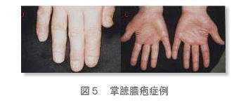 掌蹠膿疱症は手掌や足蹠皮下に多発する小水痘の発疹を起こす疾患である(図5).病態が重症になった場合,鎖骨,胸骨および肋骨等の骨関節炎を併発する場合もある.以前は,扁桃および口腔領域における病巣感染,ついで金属アレルギーが病因とされていた.しかし,最近になり掌蹠膿疱症患者は特異的に腸内細菌のアンバランスによるビオチン欠乏が認められることが前橋)の報告にて示され,私たちも2年前よりビオチン療法)を採用している. 表6