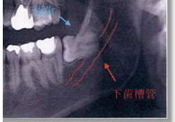 下顎の骨の中には、下歯槽管というトンネルがあり、下顎の後ろの方から下唇の斜め下ぐらいまで続いています。この中には神経と血管が走行しており、この神経(下歯槽神経といいます)は、骨の中のトンネルを出た後、下唇周囲まで枝を伸ばし、主に歯の感覚や、下唇とその周囲の感覚を担当しています。抜歯の際に問題になるのは、智歯の根の先と下歯槽管の位置関係です。根の先がトンネル内に突出していた場合、抜歯によりトンネル内に穴があき、神経血管の損傷の原因になります。血管損傷時には、強い出血により抜歯を中止する事もあり得ます。